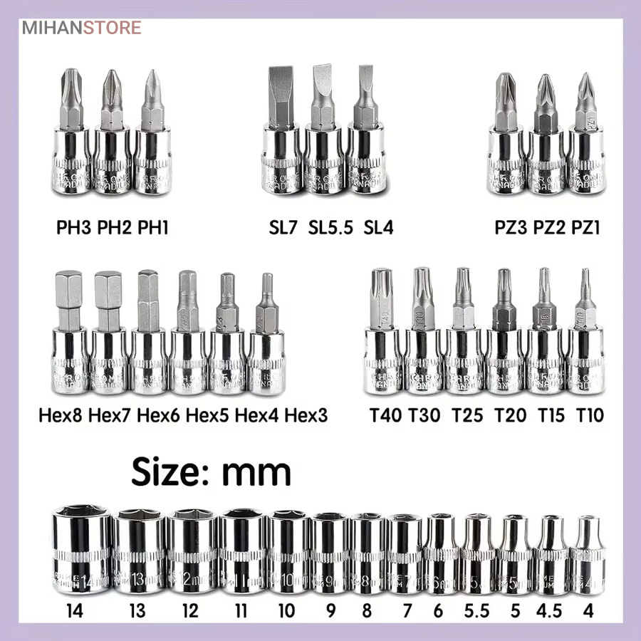 - 13 عدد سری بکس در سایزهای ۴، ۴.۵، ۵، ۵.۵، ۶، ۷، ۸، ۹، ۱۰، ۱۱، ۱۲، ۱۳ و ۱۴ میلی‌متر