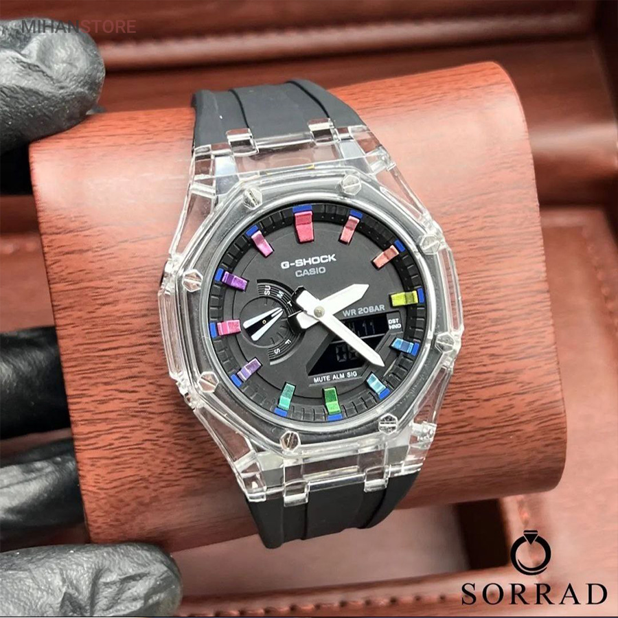 ساعت مچی ضدآب کاسیو جی شاک - GA2100، یک ساعت مدرن و مقاوم است که برای افراد فعال و علاقه‌مند به سبک‌های ماجراجویانه طراحی شده است. این ساعت مچی جی شاک دارای بند رابر مشکی و صفحه مشکی است که به آن ظاهری اسپرت و شیک می‌بخشد. جنس رابر بند، علاوه بر سبک بودن، بسیار مقاوم و ضد ضربه است که آن را برای استفاده روزمره و شرایط سخت مناسب می‌کند. این ساعت دو موتوره می باشد و به صورت های کپی (با کیفیت فوق العاده بالا) تولید شده است و همراه با جعبه ای شکیل عرضه می شود.
